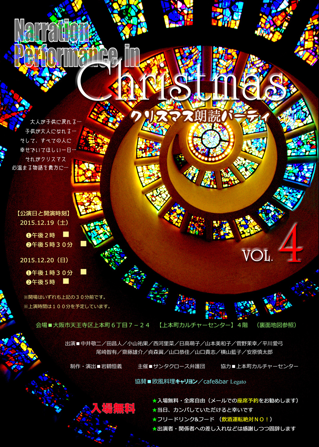 2011年を最後に開催して来なかった「クリスマス朗読パーティ」を今年は4年ぶりに開催することにしました。その告知です。スンマセン!!