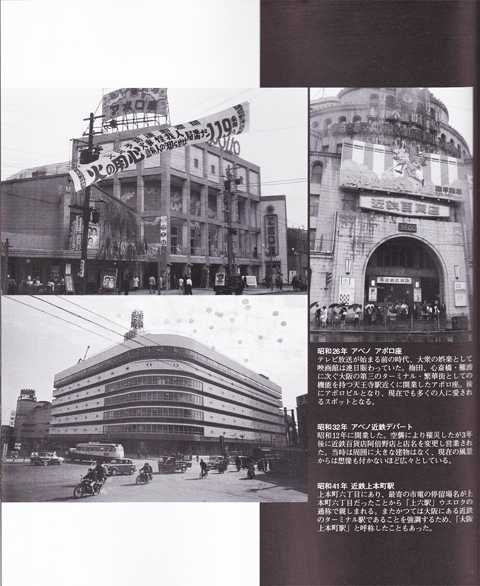左上:あべのアポロ座という映画館だそうです。このアポロ座には現在「あべのアポロビル」が建っています。アポロビルは複合商業ビルで、テナントの三木楽器さんには高校時代にお世話になりました!(昭和26年の写真だそうです)