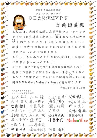 フォークソング部の歌声パーティーでMVP賞を授与された岩鶴君